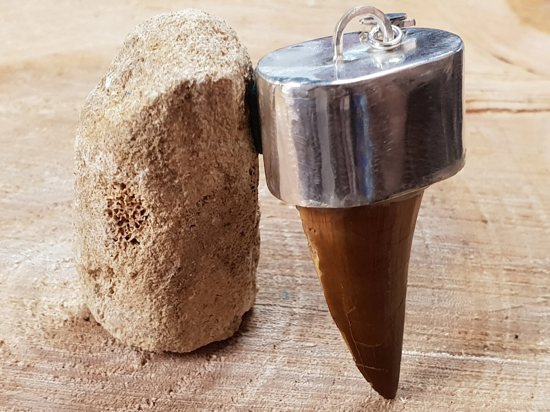 Ahhh the mosasaur, a bit of Dutch history and something I personally am proud of. the Mosasaur is a reptile that swam in western Europe some 70 million years ago. it was first discovered in Maastricht. hence the pride. it was cool to work with something like this but, the tooth was fairly brittle. The cap is made of silver to make it a neat necklace. I sold this piece at BOEL.