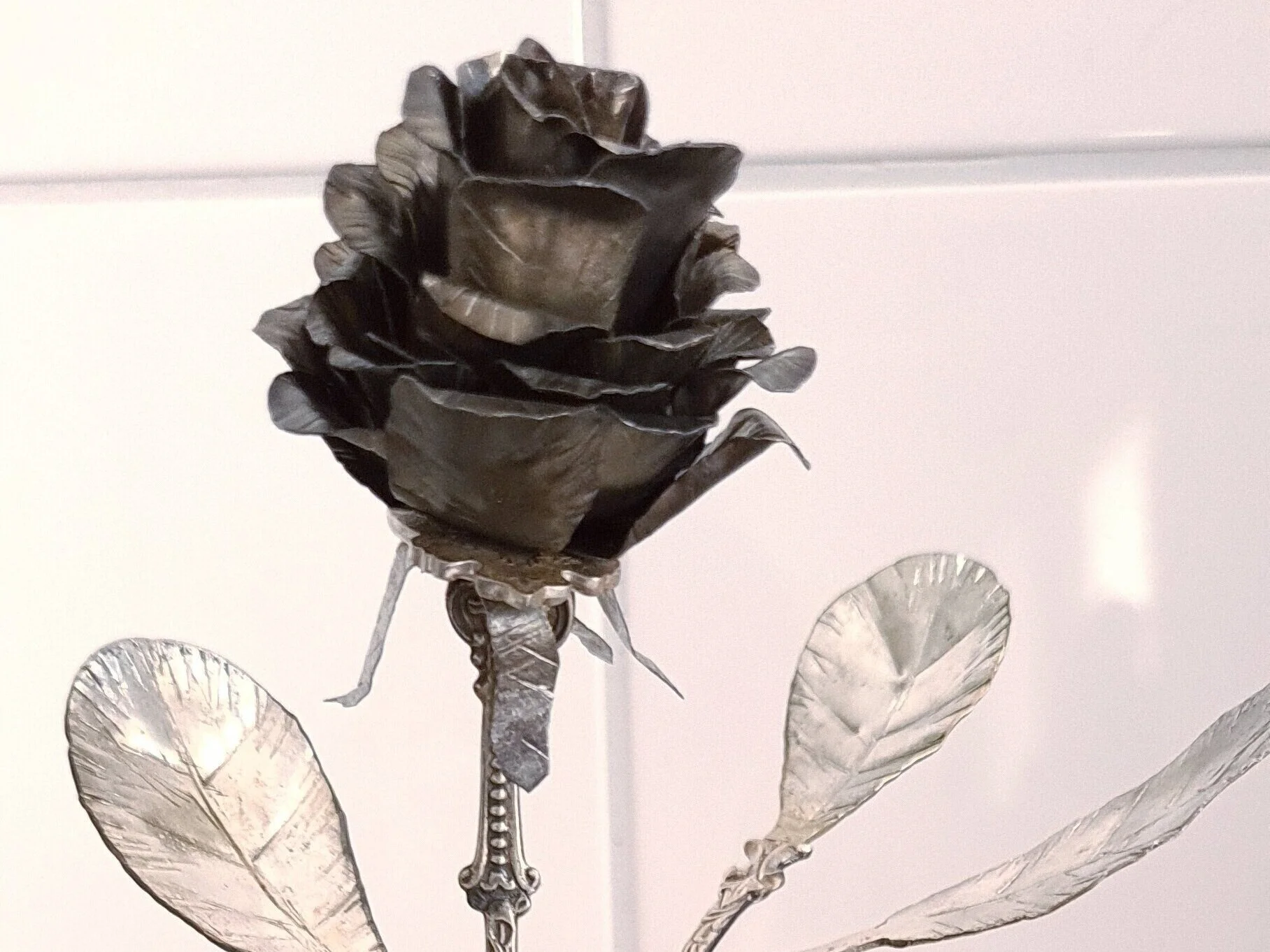 This rose is fairly unique from my other flowers, it is made using various silver spoons. Silver spoons rarely are pure silver, usualy its another aloy that has been silver plated. knowing this it was quite fun seing the different aloys and how they’d react being pressed.